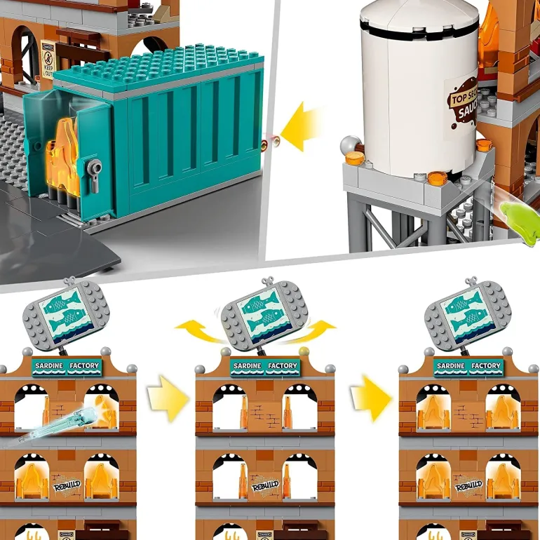 The sardine factory measures over 12 in. (30 cm) high, 13.5 in. (34 cm) wide and 12.5 in. (32 cm) deep. Contains 766 pieces.