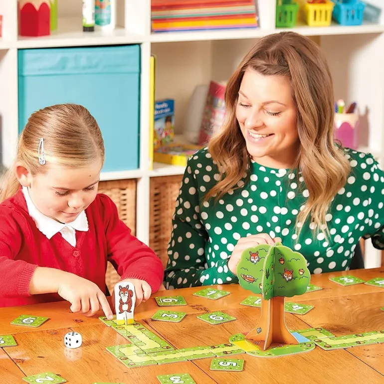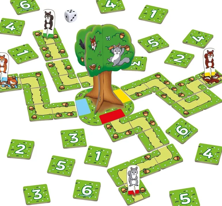 Players take it in turns to roll the dice, and pick up cards with the matching number, before adding them to their path. If a player turns over a squirrel picnic card, the matching coloured squirrel has collected enough acorns and their adventure ends. Once all players have ended their path, they count up the acorns on their path – the player with the most acorns is the winner!