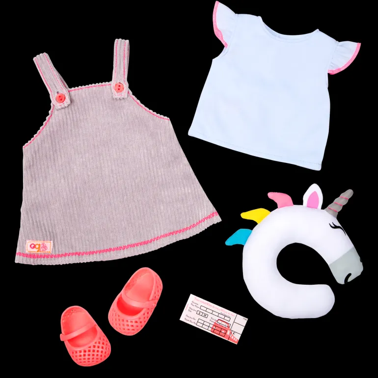 Take your bestie on a bright adventure with the Our Generation Unicorn Express outfit for 46cm dolls! Dress your doll in the light-blue, ruffle-sleeve top – it opens in the back for an easy slip-on change. It also features a trendy overall dress that’s perfect for the fall weather, and the happy unicorn pillow is just the thing to keep your doll cozy during her travels! Slip on the light pink shoes to highlight the outfit and don’t forget to grab your OG Express ticket, there’s a lot of places to see! This outfit works great on its own or with the OG Express train cabin, traveling by train is ever so fun! (Dolls and OG Express sold separately)