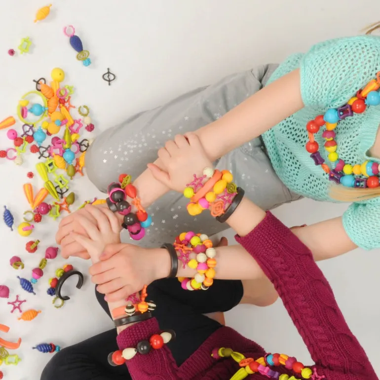 Pop! Pop! Pop! Just try and stop! The B.eauty Pops jewellery making set from B. toys comes with 150 pieces that feature a variety of colours, shapes, and textures. Mix and match to create a ton of B.eautiful necklaces, bracelets, and rings – the combinations are endless! All of the reusable beads snap together simply, quickly, and safely. Your little jewellery maker can spend hours designing unique pieces for the whole family, then pop ’em apart and start all over again. Not to mention, cleaning up and traveling is hassle-free – just store all of the beads in the handy jar and carry it with the help of the handle. And because we at B. keep the environment in mind, parents will also be happy to know that our packaging is 100% recyclable. Recommended for kids 4 years and over.