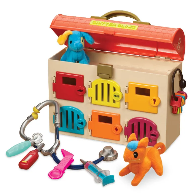 Keep kids busy for 9 lives or 7 dog years with the Critter Clinic from B. toys! This colorful animal hospital comes with 6 private rooms and 6 matching keys. Your vet in the making can play a color matching game, then treat a kitten or puppy with 5 kid-friendly tools – a stethoscope, mirror, syringe, tweezers and a thermometer. Not to mention, this vet kit doubles as storage and is easily portable, thanks to the handy handle on the roof! Playing pretend and caring for these plush patients can also develop a child’s sense of empathy and teach them about the importance of care. And because we at B. keep the environment in mind, parents will be happy to know that our packaging is 100% recyclable!