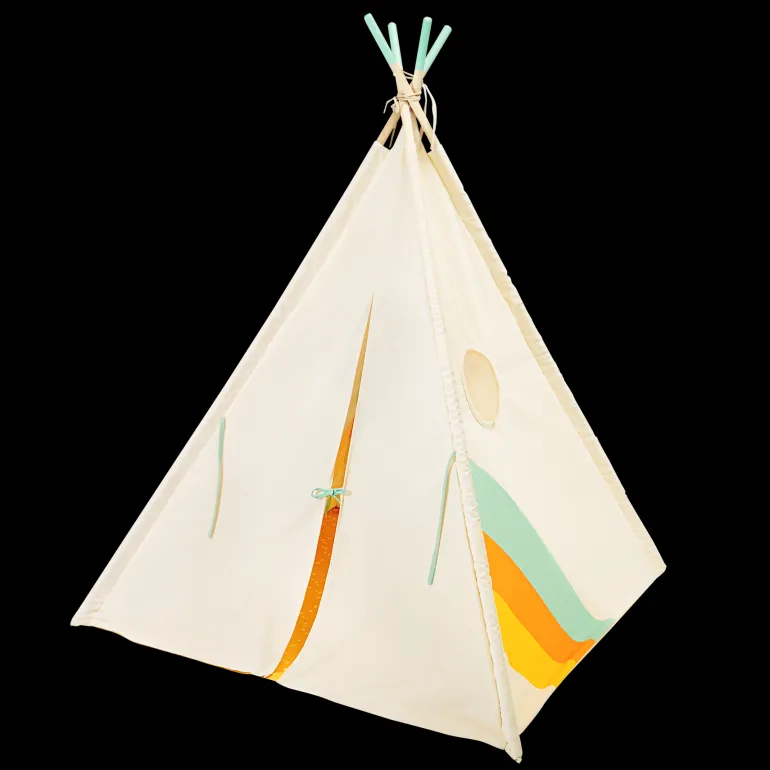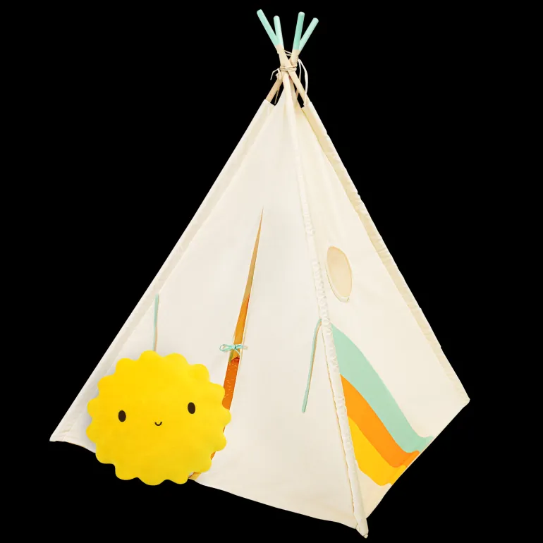 The Happy Hideaway tent from B. spaces is the perfect place for playtime with pals or plush buddies! This play tent for kids is made out of cotton fabric and features a built-in base, two round windows, rainbow patterns, and twinkly string lights. It also comes with wooden poles and an anti-collapse kit that firmly holds this tent in place. Not to mention, the Happy Hideaway tent includes a comfy sun-shaped pillow for an extra touch of coziness! This indoor tent doubles as a great reading nook, a fun fort, a sleepover spot, or as the centrepiece of a pretend campsite. And as kids play, learn, rest, and dream in this trendy tent, they’ll also be developing their creativity and independence! 3 AA batteries for the string lights are required and included. Recommended for children 3 years and over.