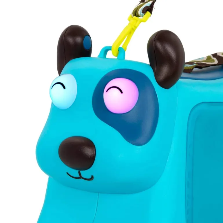 On the Gogo – Woofer from B. toys is a great traveling companion – perfect for sleepovers or a lil’ vacation! Whether you ride on or tow along, this carry-on sized toy can easily double as a suitcase for toddlers. It’s lightweight, sturdy, and fun! See Woofer’s eyes light up and hear a little woof when you press on his ears. This ride-on suitcase also comes with a removable strap and a cute little bone to pull Woofer along. This luggage for kids is lockable and easy to open with the bone or a coin. And because we at B. keep the environment in mind, parents will also be happy to know that our packaging is 100% recyclable. 3 AAA batteries are required and included. Holds up to 110 lbs (50 kg).
