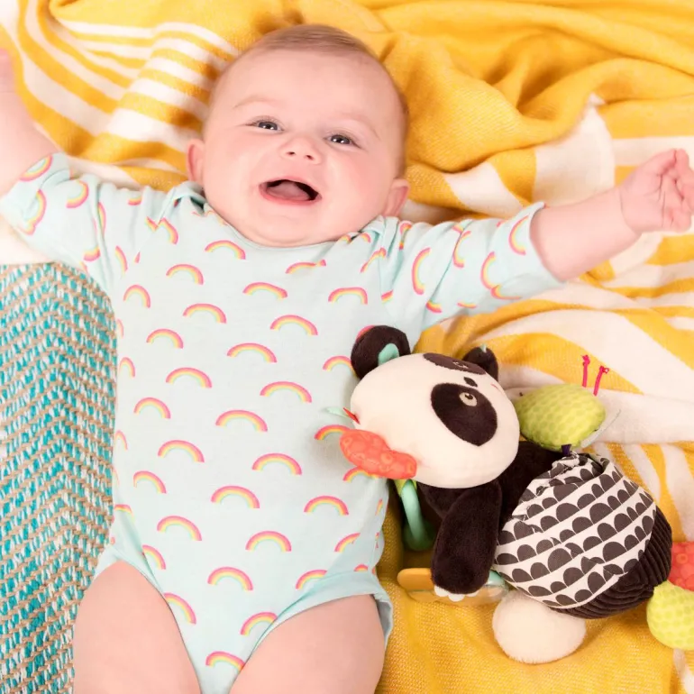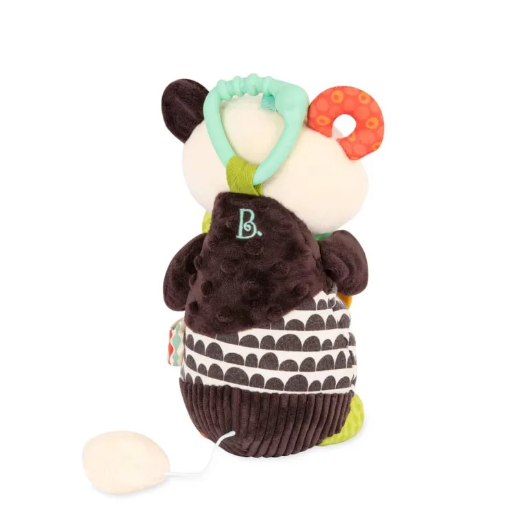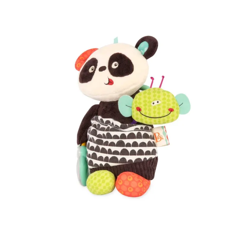 colours here, textures there, sensory fun is everywhere with the Party Panda from B. toys! This plush panda comes with a ton of interactive features for your baby to enjoy. They can explore all of the vibrant colours and wacky patterns. They can touch and feel soft textures such as lines and bumps. They can pop the happy fly out of this panda’s pouch and play. Or they can grab the tiny hands-friendly ice cream cone, nibble on it, then shake it like a rattle! With so many things to see, touch, and hear, this stuffed animal is sure to spark your little one’s sensory development – and improve their fine motor skills too! Soft and cuddly, this panda is great to play with no matter where you go… or choose to nap. Recommended for newborns and older.