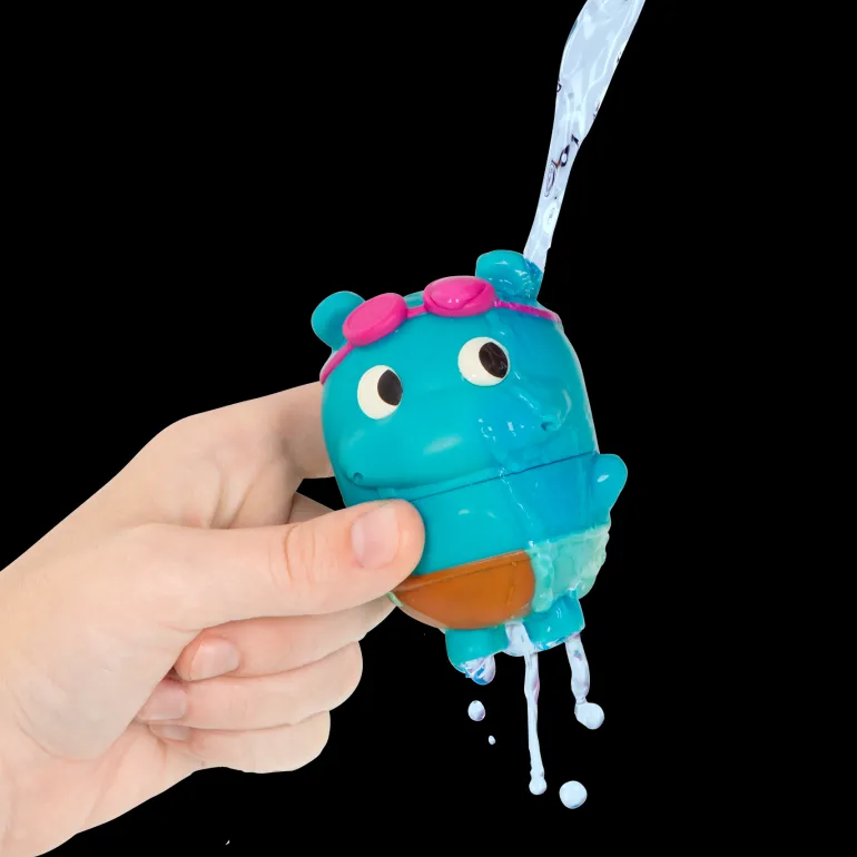 Make waves in the bath with the Pull & Go Rider from B. toys! Watch Sunny the hippo zoom here and splash there by simply pulling on the little fish – this toy jet-ski is totally kid-powered! If you want to switch it up, you can easily pop Sunny out of the bath boat and fill this little swimmer up with water to ensure the splashiest experience. When the water is warm, this happy hippo’s swimsuit color magically changes right before your eyes! To make this aquatic experience that much more exciting, collect the other animal bath squirts from our Squish & Splash sets – they fit in the jet-ski (sold separately)! Recommended for children 10 months and over.