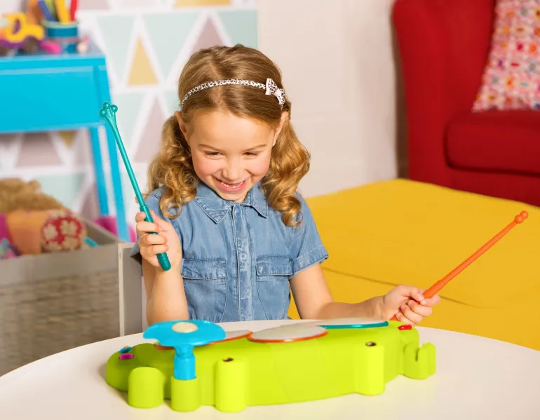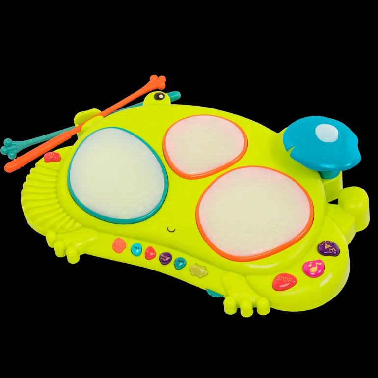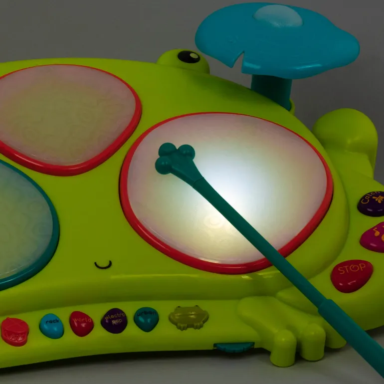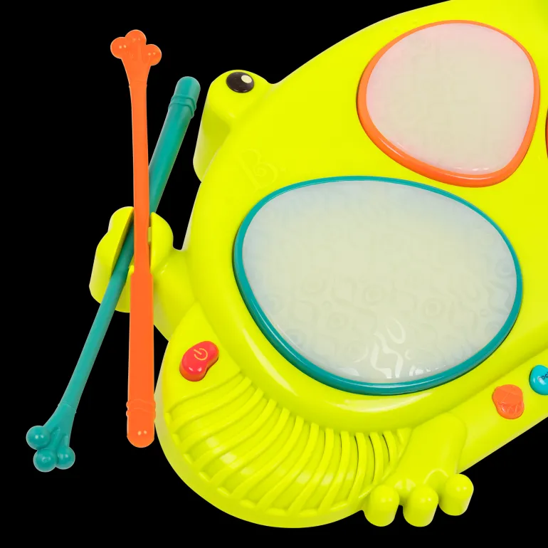 Get movin’ and groovin’ with Ribbit-tat-tat from B. toys! This lightweight and easily portable frog-inspired drum set is great for musicians in the making. Toddlers can drum it out to a range of sound effects, control the beat, listen to familiar nursery songs, and have some sluuuurpalicious froggy fun with the Catch-the-Fly game. To play, simply press the Catch Me button, then tap a light-up pad (with hands or the included drumsticks) when you see a fly appear – just B. sure to do it before it lands on another pad! With its sturdy construction, this toy drum is the perfect way to introduce kids to music. And because we at B. keep the environment in mind, parents will be happy to know that our packaging is 100% recyclable! 4 AA batteries are required and included. Recommended for mini musicians 2 years and over.