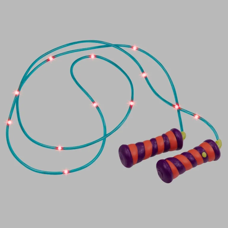 Get moving and grooving with the light-up Skippity Doo Da jump rope from B. toys! Grab the handles and jump up and down to see colourful lights shine all around. Kids can choose between 2 different modes as they play. If they pick Flashing Mode, the lights will flash faster as they step up the pace. If they go for colour-Changing Mode, then the lights will change colour as they skip. Playing with this skipping rope is a great way to stay active and improve balance and coordination. Hop, skip, double dutch – what’s your favourite way to play? 2 AAA batteries are required and included. Recommended for children 5 years and over.