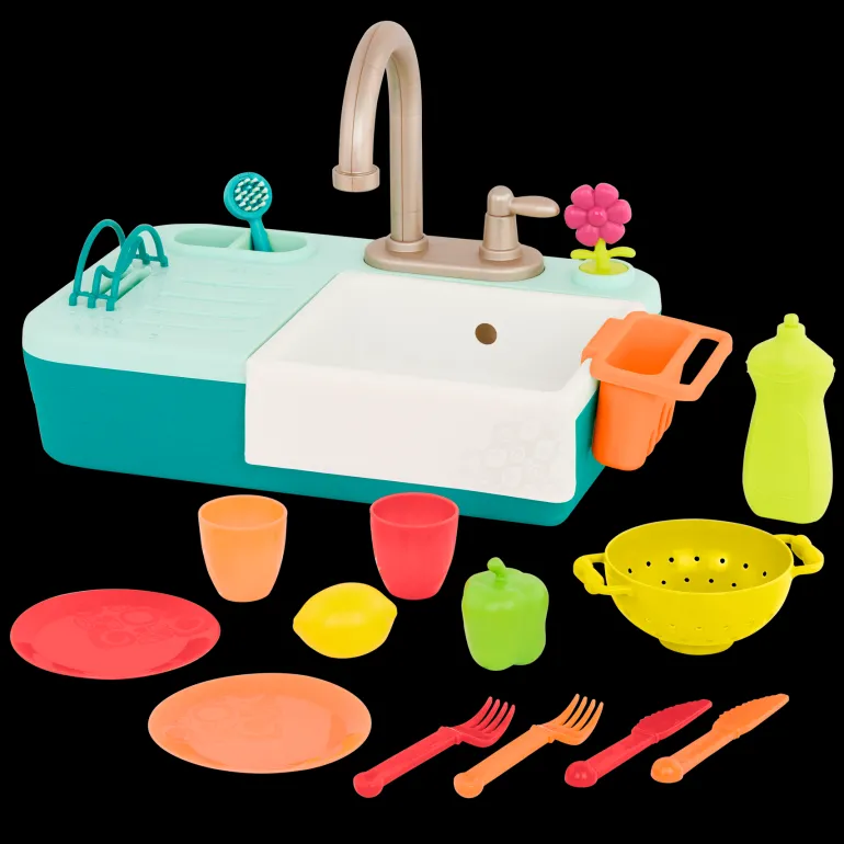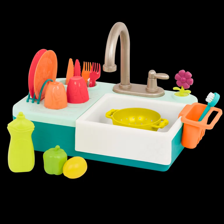 Splash, scrub, rinse, and repeat with the Splash-n-Scrub Sink from B. toys! This sink set comes with plenty of colourful accessories that kids can use to play house and learn along the way. Little fans of role-play can wash cups, plates, utensils, and more with the working faucet, toy dish soap, and scrub brush. As kiddos pour warm water on the dishes, they will see them change colour – red dishes will turn yellow, while the orange ones will turn white! After splashing and scrubbing, children can then place what they washed on the dish rack and pop the dish soap ‘n’ scrub brush in the handy sink caddy. Playing with this kitchen sink set not only comes with tons of fun, but it can also spark creativity and teach kids about important life skills. 2 AA batteries are required and included. Recommended for children 3 years and over.