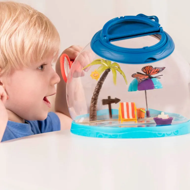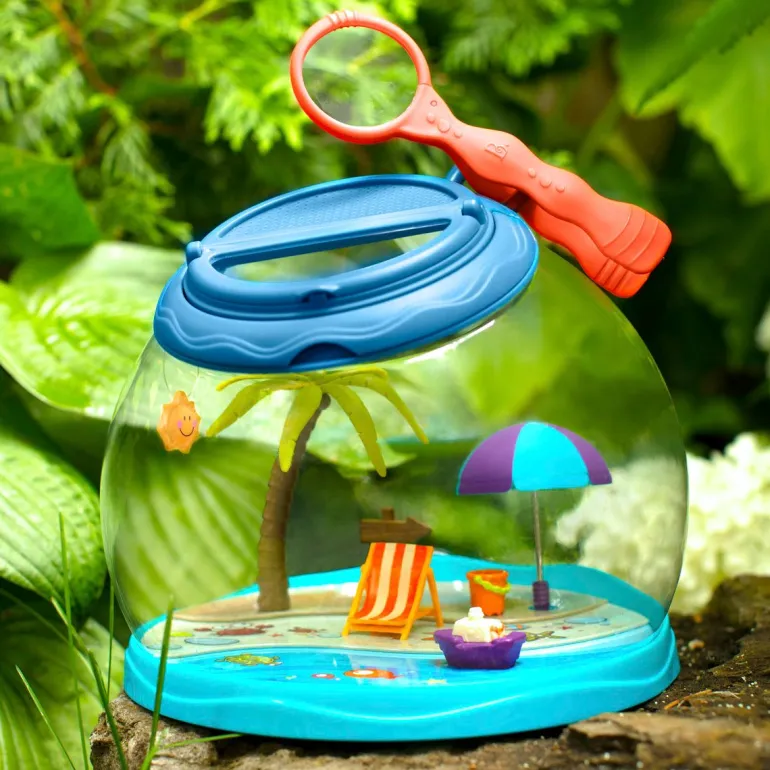 Give some critters a fun place to rest with the B. Tiki Retreat from B. toys! Use the bug-friendly tweezers to drop some of your favorite crawlies into the dome-shaped hotel and watch them climb the palm tree or lounge around in the chair! Don’t worry, the hotel has a transparent dome and a ventilated lid on top, so all of your insect friends can safely enjoy the scenery. You can even use the magnifier to get a closer look! The sturdy handle makes it easy to carry to the backyard, park, or to the beach, and it’s perfect for keeping your little one active all summer long! Recommended for kids 4 years and over.