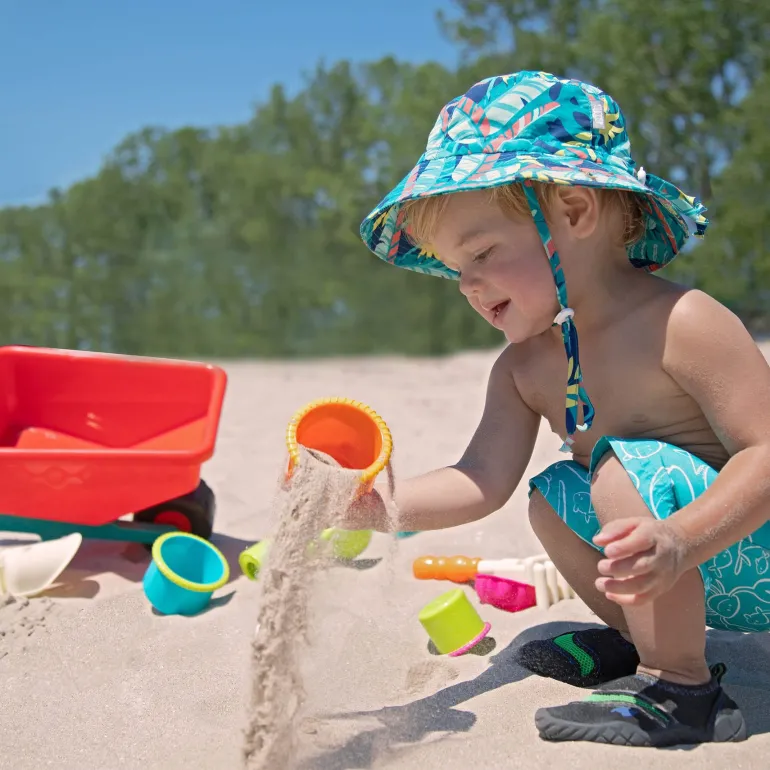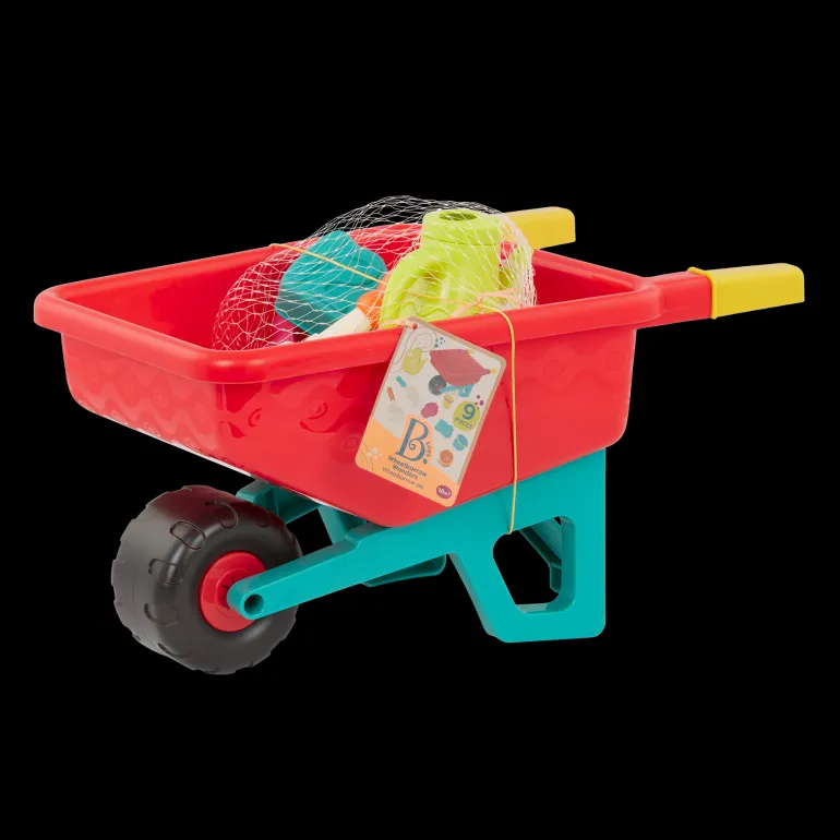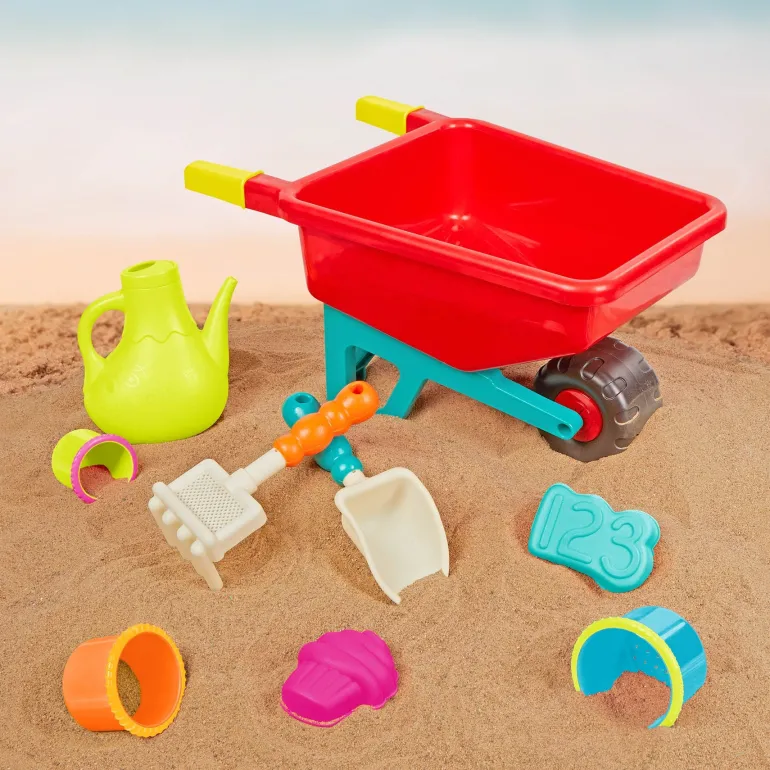 Build under the sun and have tons of sandy fun with the Wheelbarrow Wonders set from B. toys! This colourful playset is made with summertime in mind and includes a wheelbarrow, shovel, rake, 1-2-3 sand mold, cupcake sand mold, watering can, and 3 nesting cups in different sizes. With these outdoor toys, toddlers can play and build at the beach or lend a helping hand in the garden – the easy-to-hold pieces double as gardening tools! Playing with the Wheelbarrow Wonders keeps kids active and it can also improve their fine motor skills. Not to mention, all of the sand toys neatly fit into the wheelbarrow so that you can easily store this set at home after a day of play. And because we at B. keep the environment in mind, parents will be happy to know that our packaging is recyclable! Recommended for children 18 months and over.