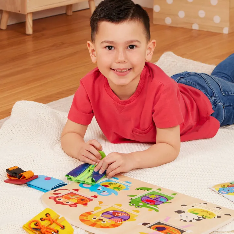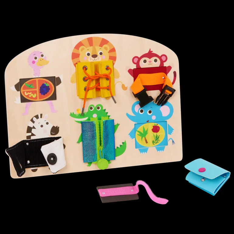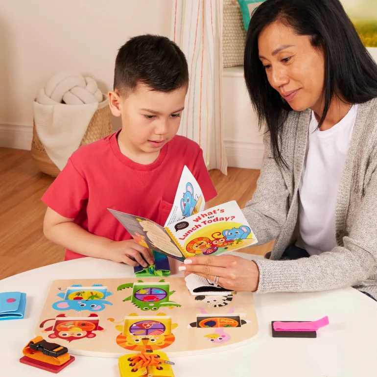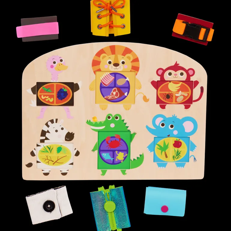 Zip! Pop! Snap! Practice using fun fasteners and discover animals’ diets with Battat Education’s “What’s in My Tummy?” With 6 common fasteners to do and undo, this activity board is great for little ones learning self-dressing skills—they can build fine motor skills and hand-eye coordination along the way too! Plus, as kiddos play with the activity board, they’ll discover diverse textures like fuzzy fabric and smooth plastic and build tactile skills. And there’s more fun under the blocks—remove ‘em to find out what each animal likes to eat! This basic skills board is a great educational tool for teaching little ones what herbivores, carnivores, and omnivores eat.
