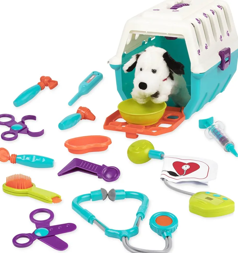This set comes packed with all the essentials to take care of your furry friend! This 15-piece set includes a pet carrier, a cute cuddly Dalmatian, and 13 other tools! Everything provided easily fits in the crate. The durable carrying crate is perfect to store your pup as you travel and also doubles as a secure holder to keep all the pieces of the veterinary clinic in one piece. Size 8 x 8 x 10.25 inches.