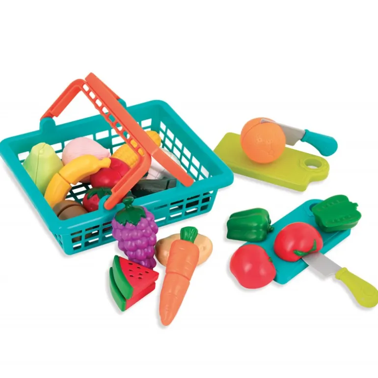 Whether it’s fresh tomatoes or big round potatoes, your toddler will love pretend play grocery store with the Battat Famers market basket. Filled with plastic play food, 2 cutting boards and 2 safe plastic knives to cut fruits and vegetables, this basket is easy to grab and bring anywhere.