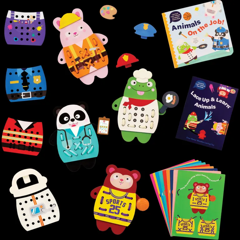It’s time for work—help Battat Education’s Lace-Up & Learn Animals get dressed! This educational playset combines lacing fun with career exploration. It comes with 4 adorable wooden animals and 8 wooden outfits that represent 8 different occupations! Kiddos can build fine motor skills and hand-eye coordination as they lace outfits on animals: there are lacing patterns to follow on the cards, or they can create their own unique lacing pattern. This playset also comes with 9 accessories to complete the animals’ looks! Little ones can learn more about different careers with occupation cards and the picture book—with fun illustrations, these pieces can promote curiosity and spark conversations between you and your child.