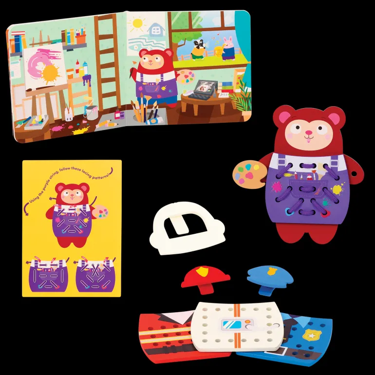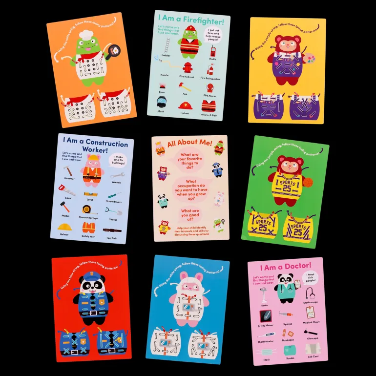 There’s also a question card included that can help kiddos self-reflect on their interests. If you’re looking for some guidance, the play guide is full of educational activities focused on lacing, pattern matching, occupation exploration, and more.