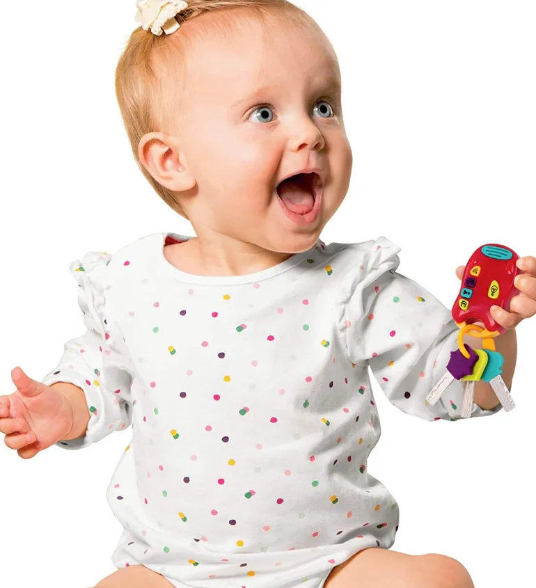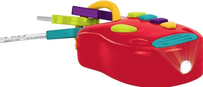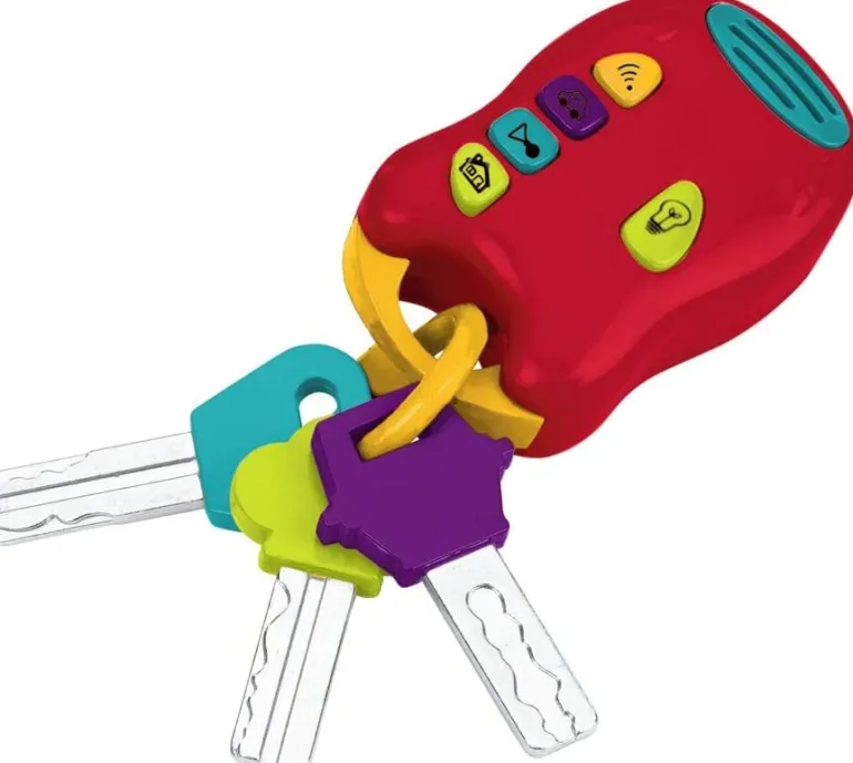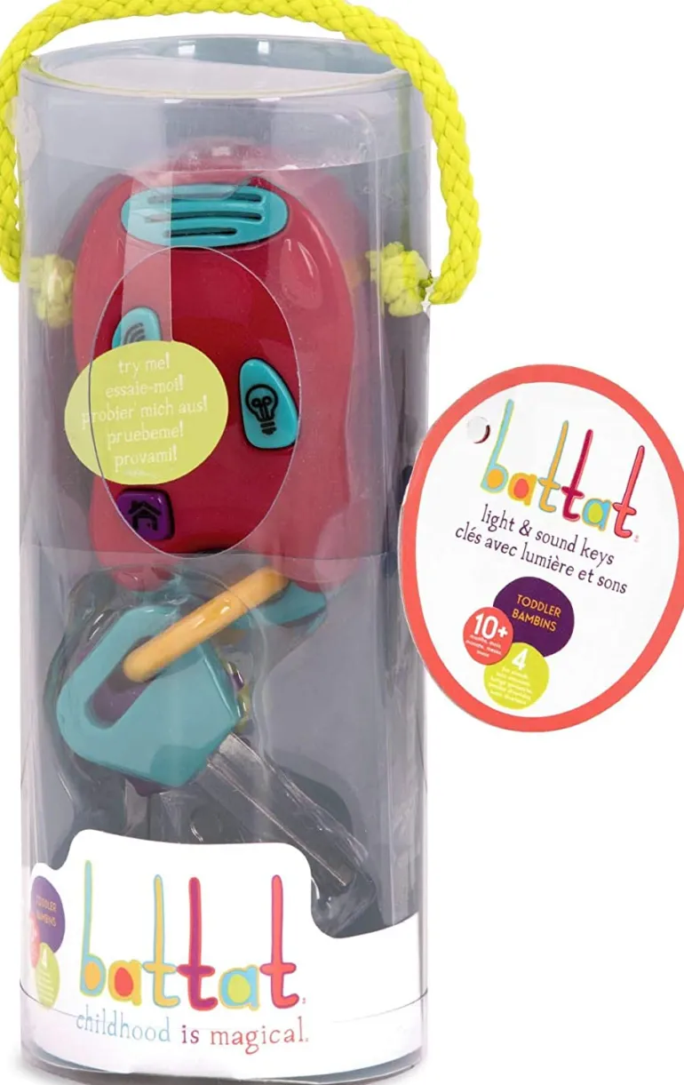 Ding-dong, honk-honk, vroom vroom! Little ones will have lots of pretend play fun with the Battat light & sound keys! This fascinating, richly coloured toy features a Mini flashlight, 3 jingling keys and a sturdy belt clip for easy attachment, along with four different fun sounds.