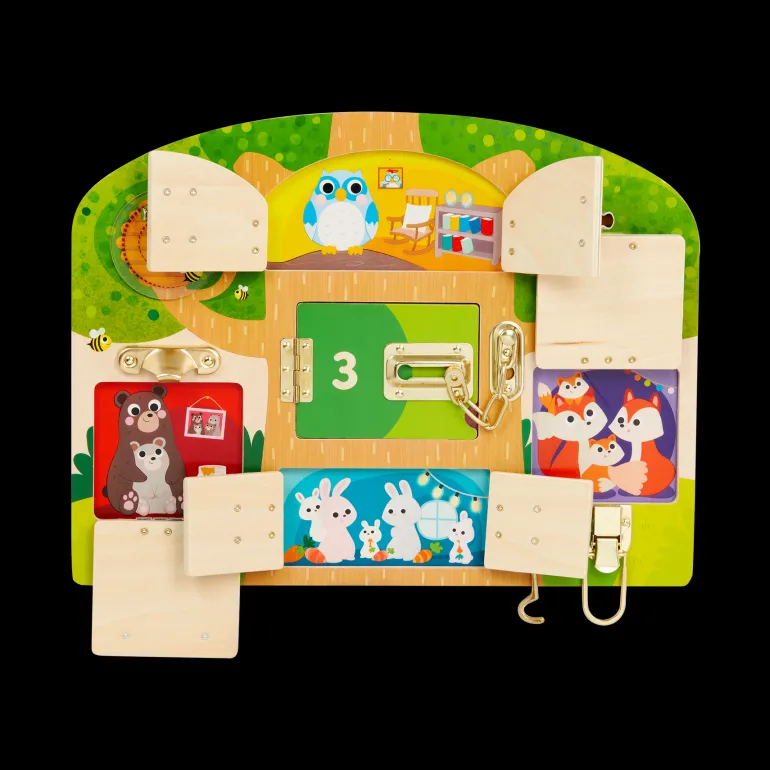 With Battat Education’s “Knock-Knock Who’s Inside?” little ones can unlock fun locks and latches on doors, then discover adorable animals behind them. This busy board comes with 5 different locks to discover—and 2 spinning panels too! Playing with the locks and panels can help kiddos build fine motor skills and hand-eye coordination.