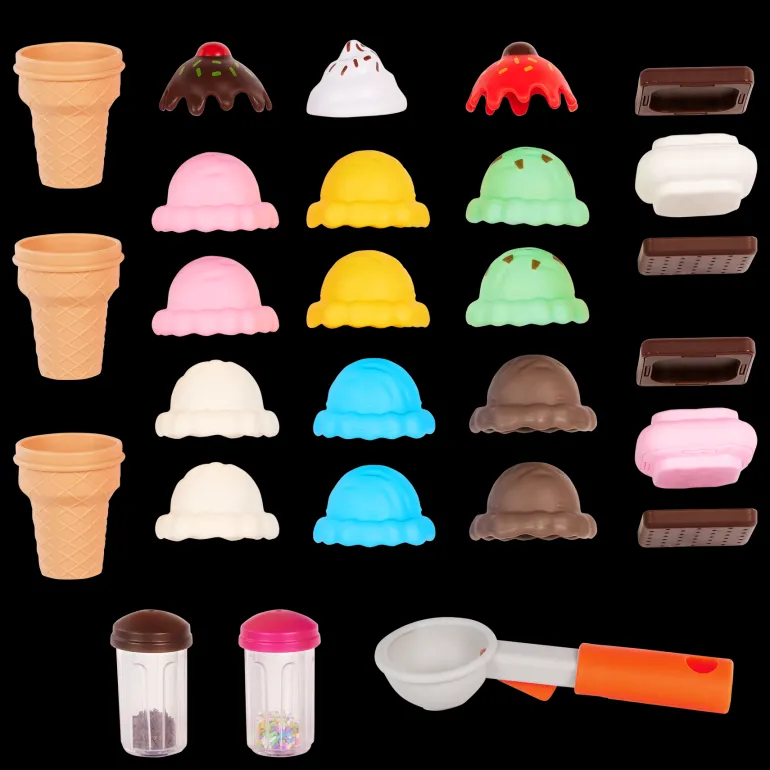 Treat little ones to the Sweet Sprinkles ice cream playset from Battat! This 49-piece set of frosty toy treats lets kiddos indulge in colorful, hands-on, creative toys. Use the magnetic scooper to scoop up 12 realistic scoops of ice cream, then pop them out into a cone with the touch of a button. Stack them up high and add a whipped or chocolate topping. There are 26 play food items in this set, as well as a handy stand that keeps everything organized. Also included are 20 coins and a little menu, so kids can pretend to run an ice cream shop while practicing their counting skills. Playing with this set helps improve social skills, hand-eye coordination, and fine motor skills.