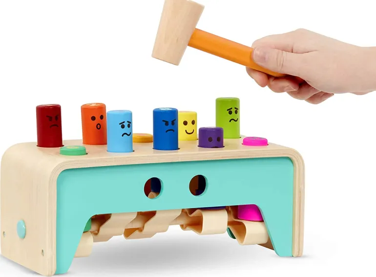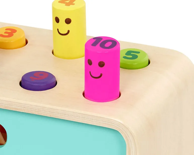 Peek-a-boo! The Pound & Count Bench by Battat comes with 10 colorful pegs and a tiny hands-friendly mallet to pound them down with. As your kiddo plays with this wooden pounding toy, they’ll be getting a hands-on lesson on the concept of cause-and-effect – when they tap the hammer on a peg, they’ll see another one pop up! Your little one can explore numbers, colors, and emotions with these fun pegs.