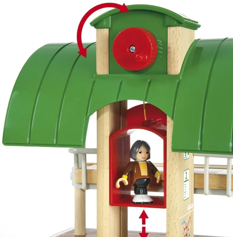 Connect one train to the other with this exciting Brio wooden railway, it’s double the fun. The Blue line train is motorized, taking passengers to the modern station with just the push of a button. Once at the 2 story station the passengers disembark and take the mechanical lift up and down with a simple turn of a crank. The free-wheeling Red line train can take passengers anywhere in the play set. Create multi-level layouts with the special train trestle, wooden track supports and rock outcroppings. There are two special mechanical switch tracks to help direct and stop the trains. The tree Brio characters are there to work in the station and ride the rails, just let your imagination determine the destination.