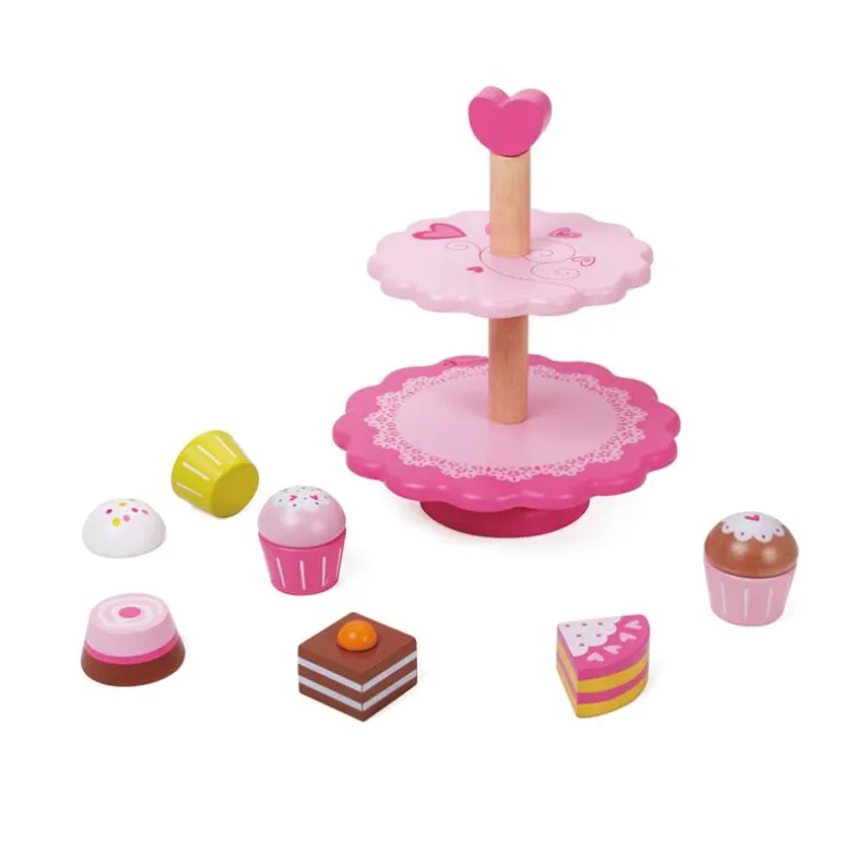 Wow! This colourful cupcake stand includes 6 wooden cakes and treats with interchangeable tops and bottoms.