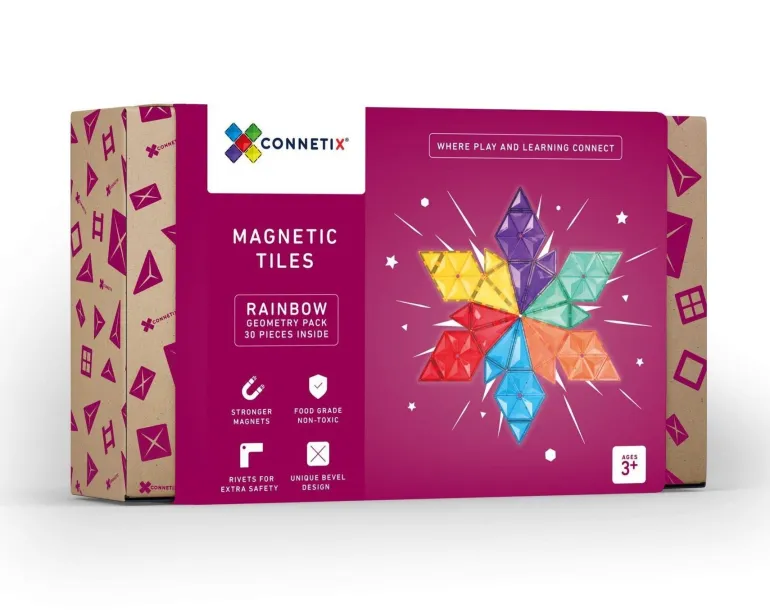The Geometry Pack includes hexagons, Connetix newly designed isosceles triangles (yes! they can form a full dodecagon), and equilateral triangles. We hope this pack will be the perfect addition to any Connetix sets you may already have and expand your possibilities for play and learning with Connetix.