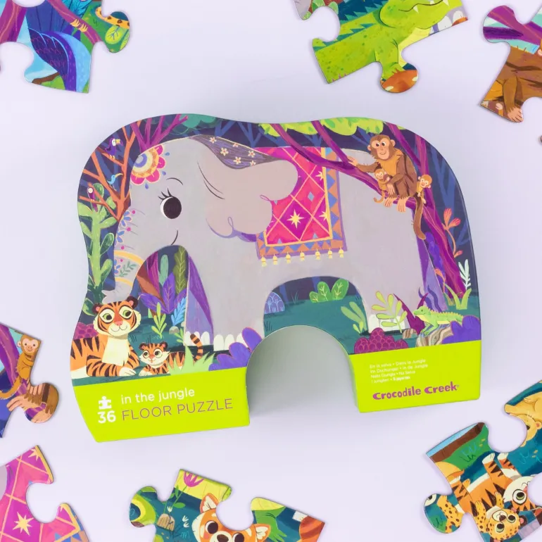 Elephants, tigers and monkeys, oh my! Children can spot their favourite wild animal in this beautifully illustrated In the Jungle 36-piece floor puzzle. All wrapped up in its unique contour-shaped storage box, the jumbo, sturdy pieces of this high-quality puzzle are ideal for little hands.