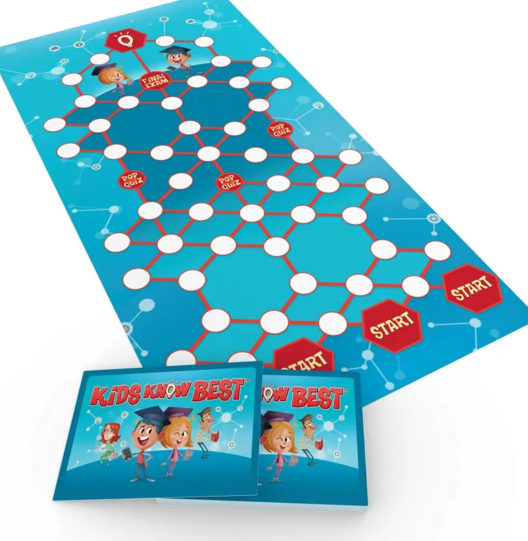 In this fun, family trivia game KIDS KNOW BEST is the first person / team that has answered all the questions correctly and has their two pawns at the finish line first. Sounds easy – but beware of the special spaces that may help you forward more quickly or… set you back!