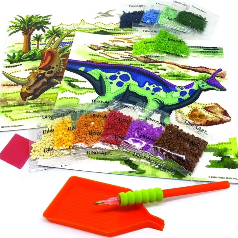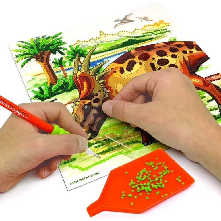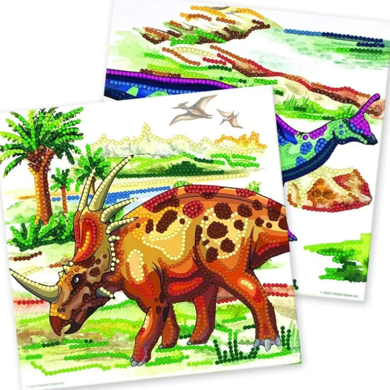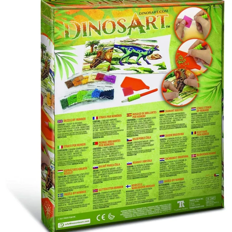 Create two unique masterpieces! Use a special applicator to apply micro-gems to adhesive templates. Follow the numbers associate with each color. The final result is astonishing! 2 ready-to-decorate printed boards 3500+ rhinestones Rhinestone pen applicator Rhinestone tray & wax square Collectible dinosaur card Color instructions