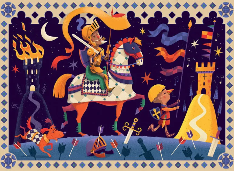 Piece together this scene featuring 36 puzzle pieces. What is Don Qixote up to? Comes packaged in a lovely silhouette box.