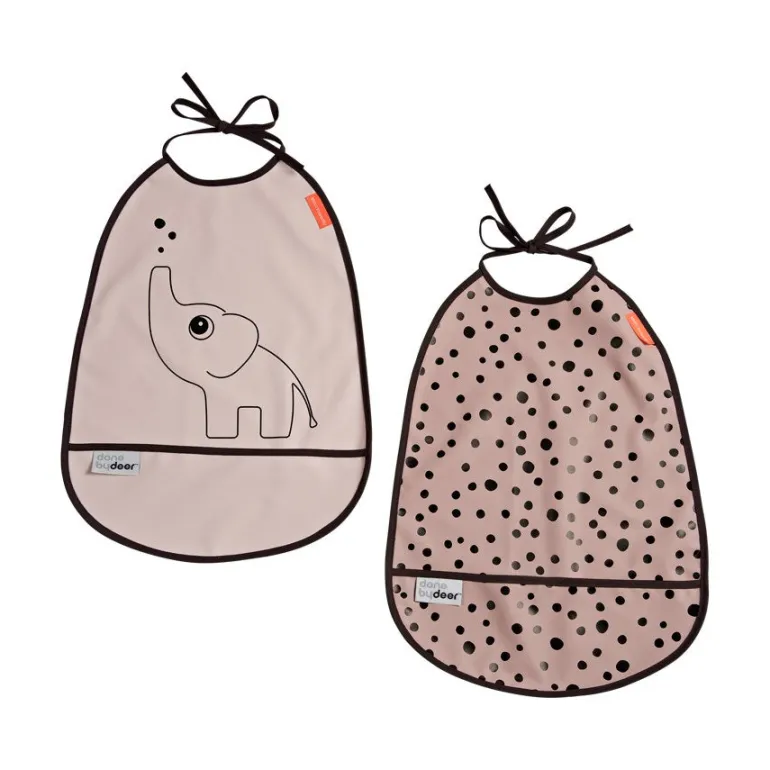 A set of two long pocket bibs in powder tones. Let sweet Elphee and Happy dots keep your little one dry at meal time.