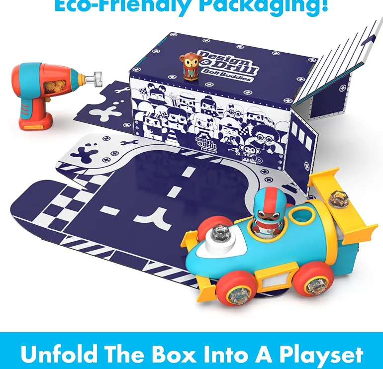 Kids use a real, working, kid-safe drill to build the Race Car, then drop the Bolt Buddy driver and his and monkey pit crew pal into the driver’s seat for some revved up pretend play fun! Imagination meets construction play with this snap-together Race Car with 6 parts, kid-friendly power drill, 9 bolts, and two Bolt Buddy figures.