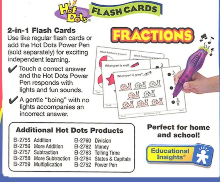 Use like regular teacher-directed flash cards with individual students or small groups. Add the Hot Dots pen (sold separately) and students can drill independently with Hot Dots instant reinforcement! Students touch pen on correct answer and get a positive response.