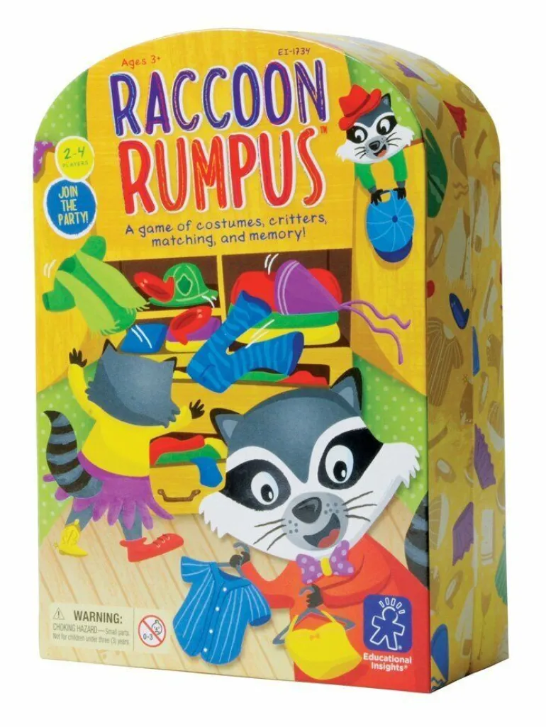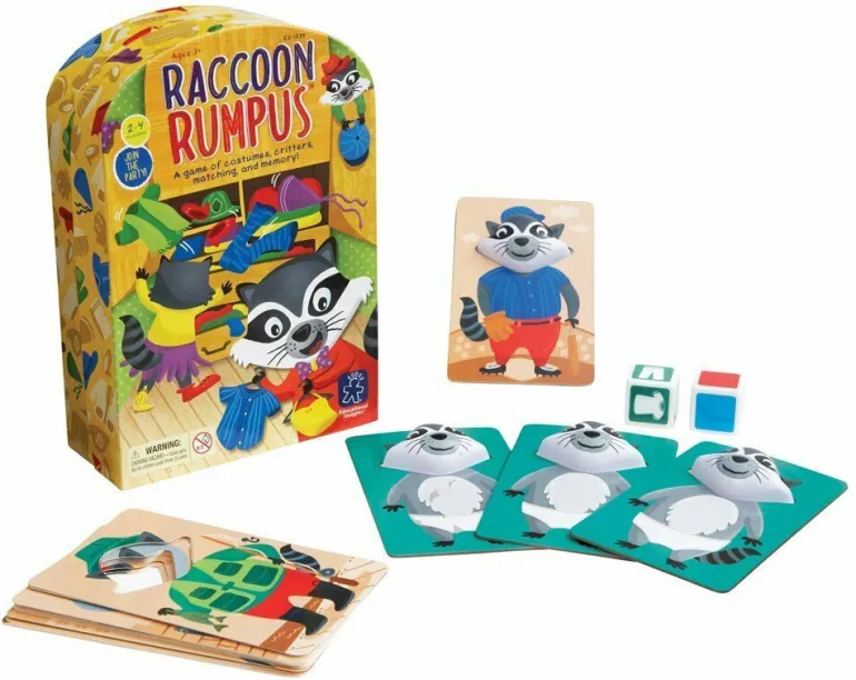 Includes 4 raccoon cards, 20 costume cards, 1 jumbo color die, 1 jumbo costume die, and game guide.