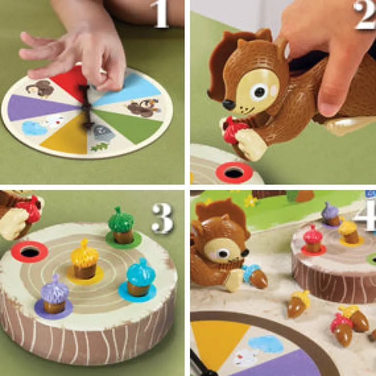 Includes one squirrel squeezer, 20 colored acorns, four logs, one game spinner and game board (doubles as packaging.).