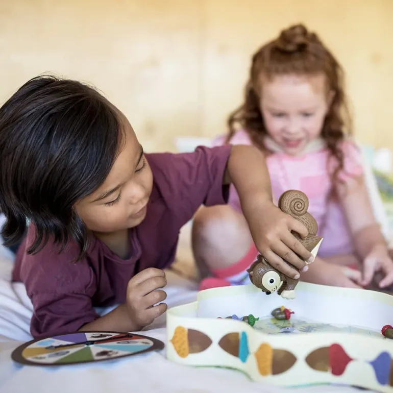 Spin the spinner, squeeze the matching colored acorn with your squirrel squeezer, and place it into your log. Be the first to fill your log with delicious acorns and you win. You could also spin “pick an acorn,” “steal an acorn,” or “lose an acorn,” so be strategic, little squirrel.