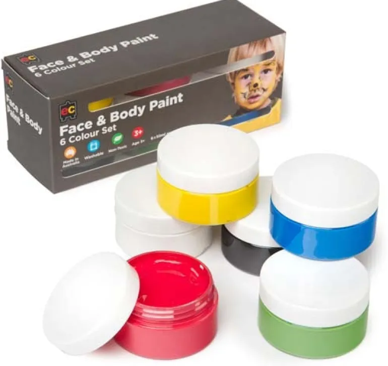 This set of high quality face and body paint is made in Australia ans suitable for all age groups. Great as a gift, school holiday activity or birthday party. This set consists of 6 50ml jars of white, blue, black, green, red and yellow face and body paint.