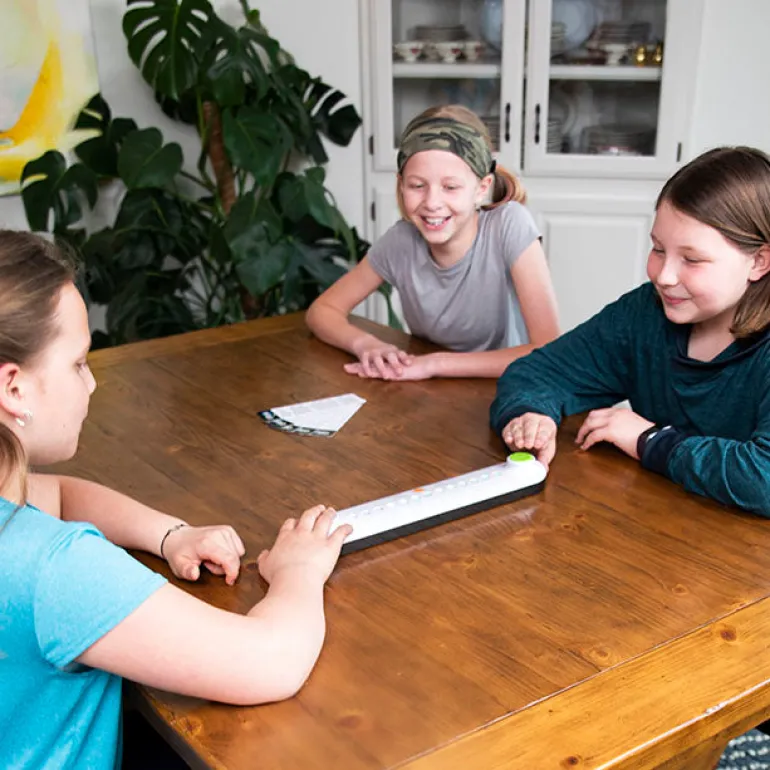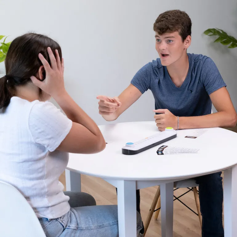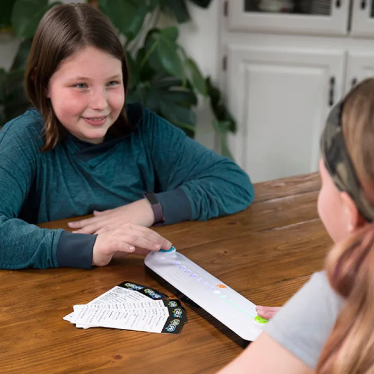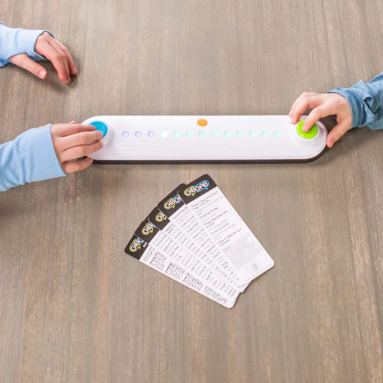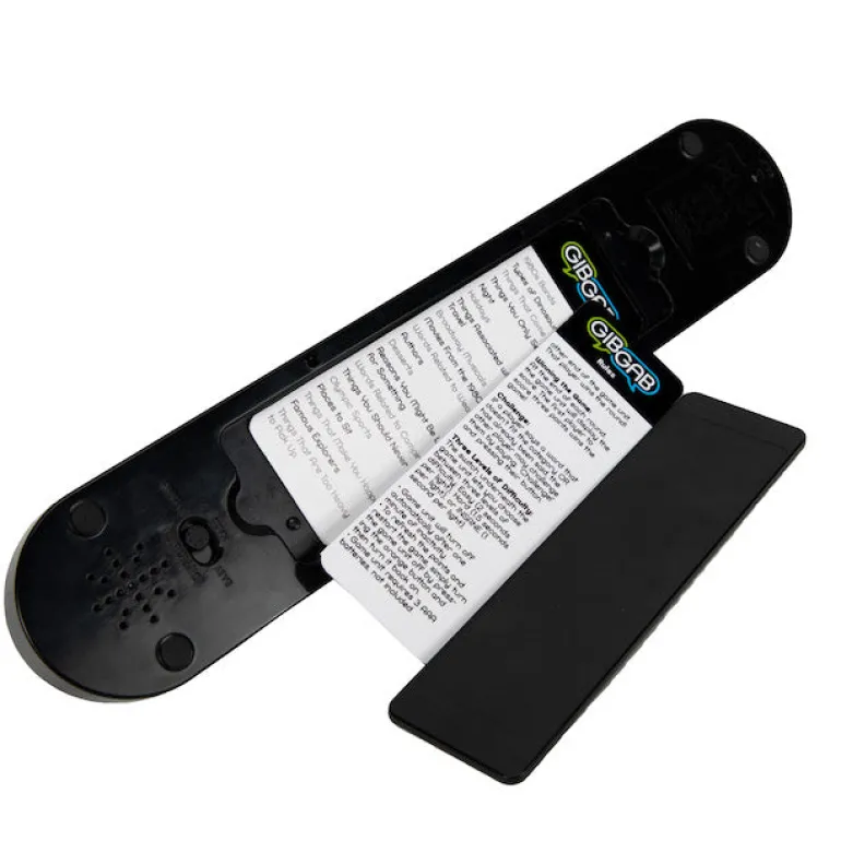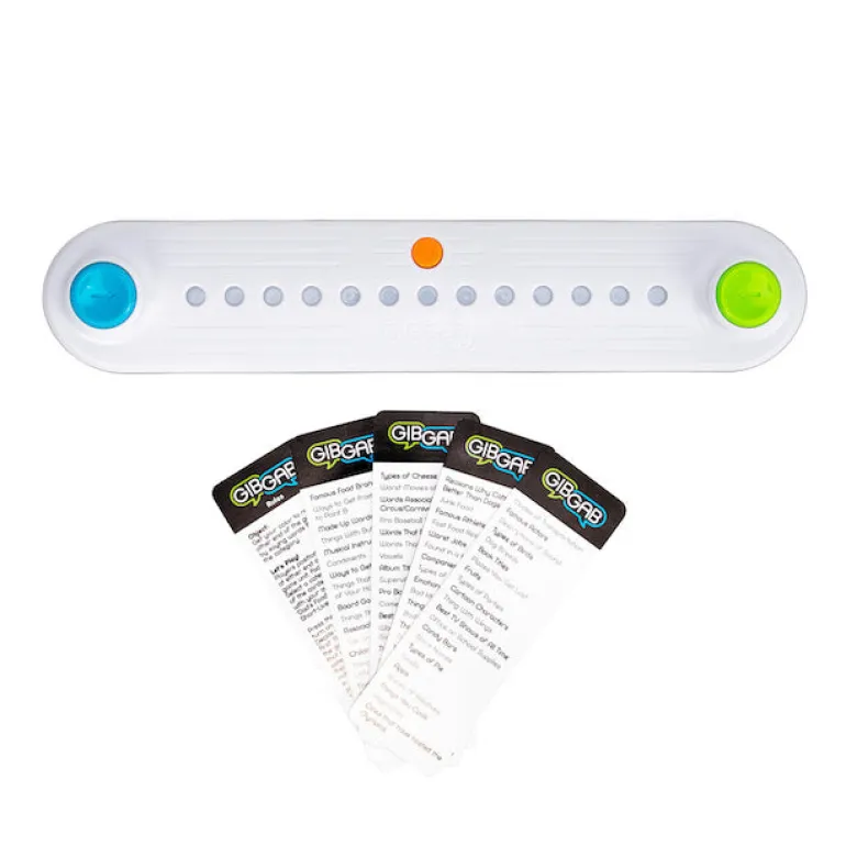 Pick a category from one of the cards and then press the center button to switch it on. The lights on the game board light up, half yours, half theirs. Quick! Say a word that matches the category and then press your button. When you do, your lights begin to move toward your opponent. Now they’ve got to think fast, say a word, and press their button to get their lights moving back toward you! You can set the lights to move either 2 seconds per light, 1 and 1/2 seconds per light, or if you’re really feeling ambitious, just one second per light. Do you have the trivia skills to keep your opponent’s lights from ever reaching your end of the game board? Enliven your next game night with the heart-racing high-pressure challenge of GibGab!