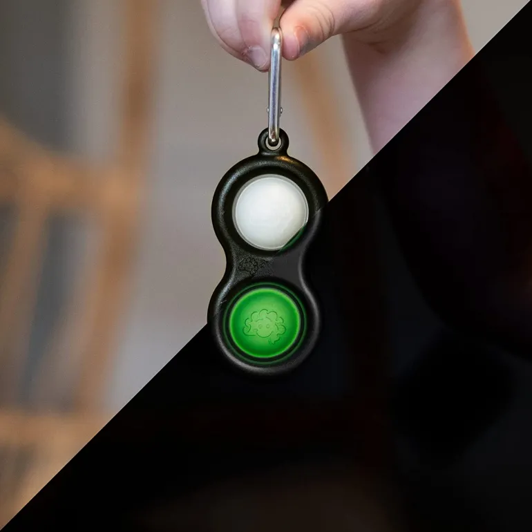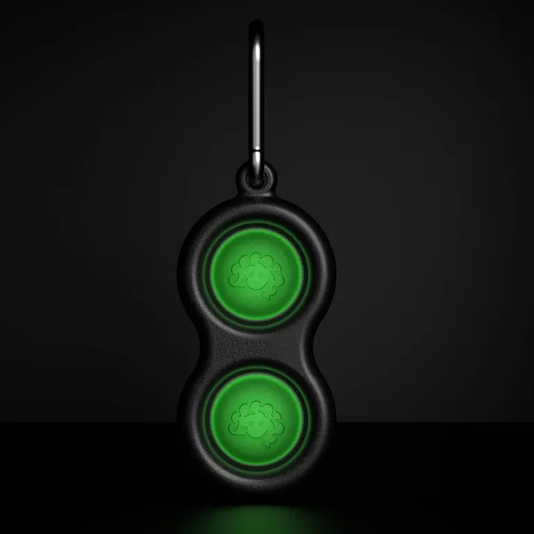 One touch and your fingers can’t stop pushing, poking, and popping. Shut off the lights and – WOW! – fascination bounds as the two buttons glow bright!