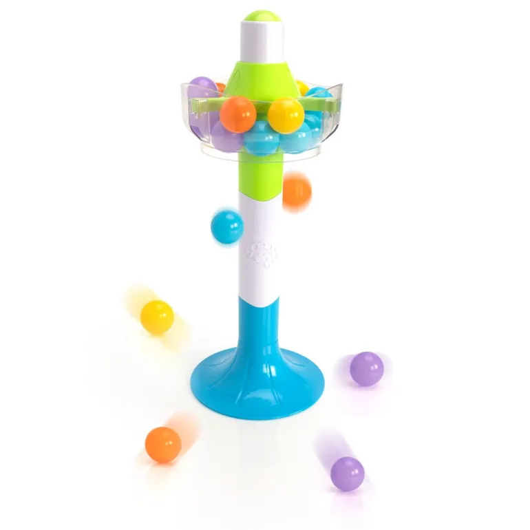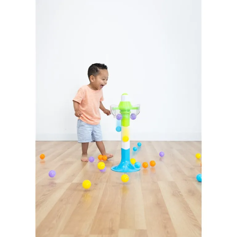 Fill the top of the tower with the 16 colorful balls and then press the button. A hidden timer starts ticking away until suddenly… CLICK.