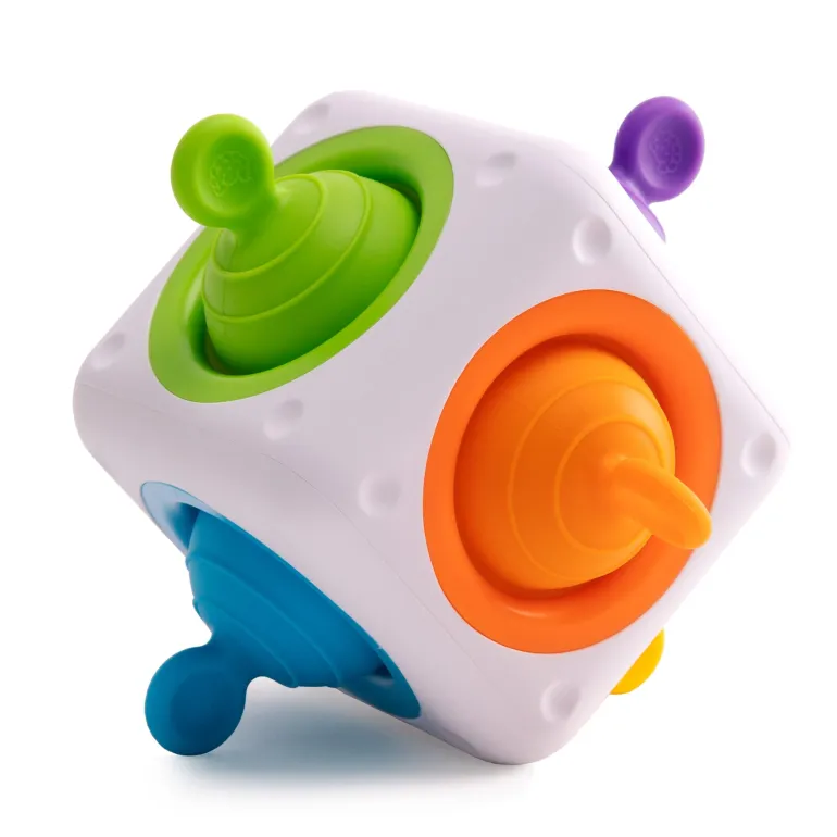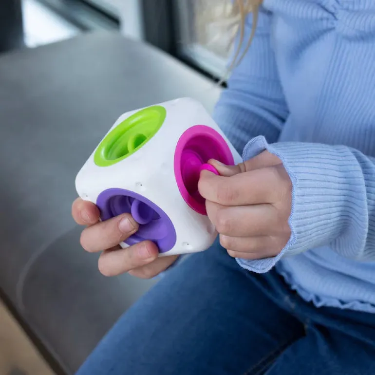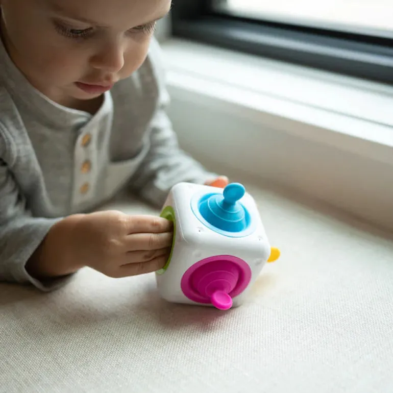 Built into each side of this sturdy, rounded cube is a soft silicone bubble with a tab to grab and pull. Fingers can’t help but push them, pull them, and pop them again and again.
