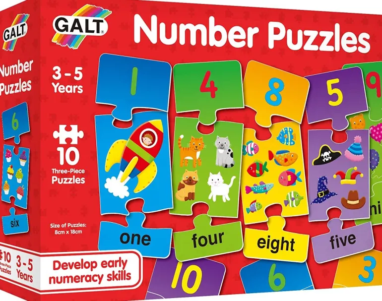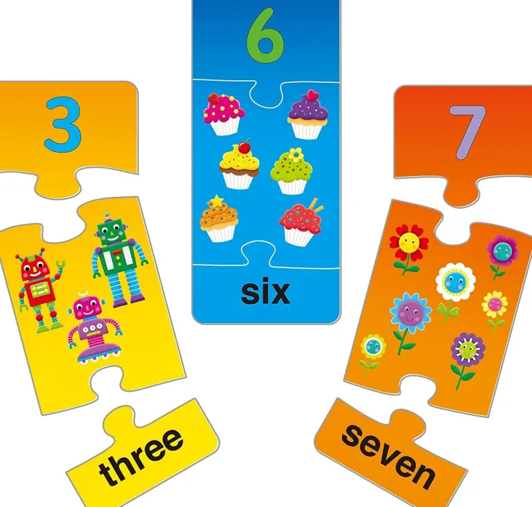 10 colourful 3 piece puzzles to develop early counting skills and number recognition.