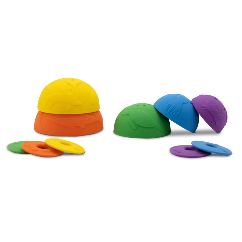 A set of 5 Stacking Cups plus 5 Treasure Coins! Our Ocean Stacking Cups can help your kids explore marine life through sensory play. Stack them up, nest them, hide objects under, texture stamp with sand or playdough…and match the coins with their cup!
