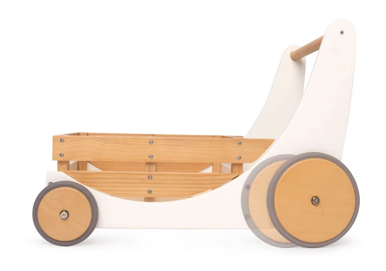 Handmade with replenishable birch wood, styled with sustainably-painted beechwood sides, fitted with adjustable wheels that have rubber trim to prevent scratches and sitting at a handlebar height of 17 inches (43 centimeters), the Kinderfeets Cargo Walker is an unrivaled option for your tiny tot! Once your child perfects walking independently, the back wheels can easily be moved a little forward to increase maneuverability. The wooden rack is also removable for toy storage.