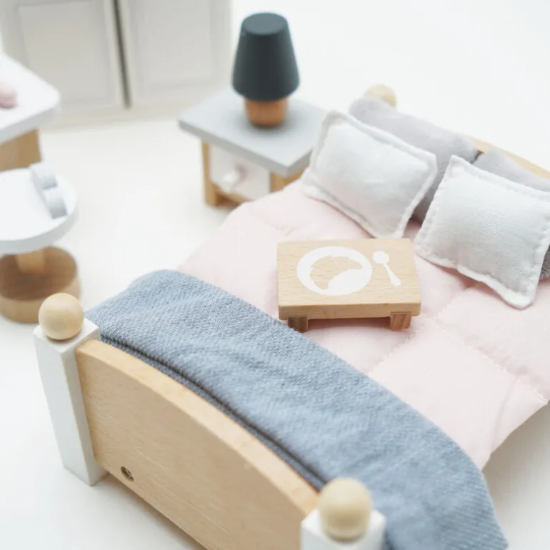 A painted wooden bedroom set that features a classic design in lovely neutral tones. Compatible with all of the Le Toy Van wooden dolls houses. Crafted from FSC™ certified wood, a restful night’s sleep beckons thanks to the comfy double bed, complete with cosy quilt and squishy pillows – all topped off with a stylish throw and wooden tray for serving up delicious breakfast’s in bed. There’s also a smart wardrobe with coat hangers, a bedside table with lamp, plus, a gorgeous dressing table, stool and accessories for acting out petit pampering sessions.