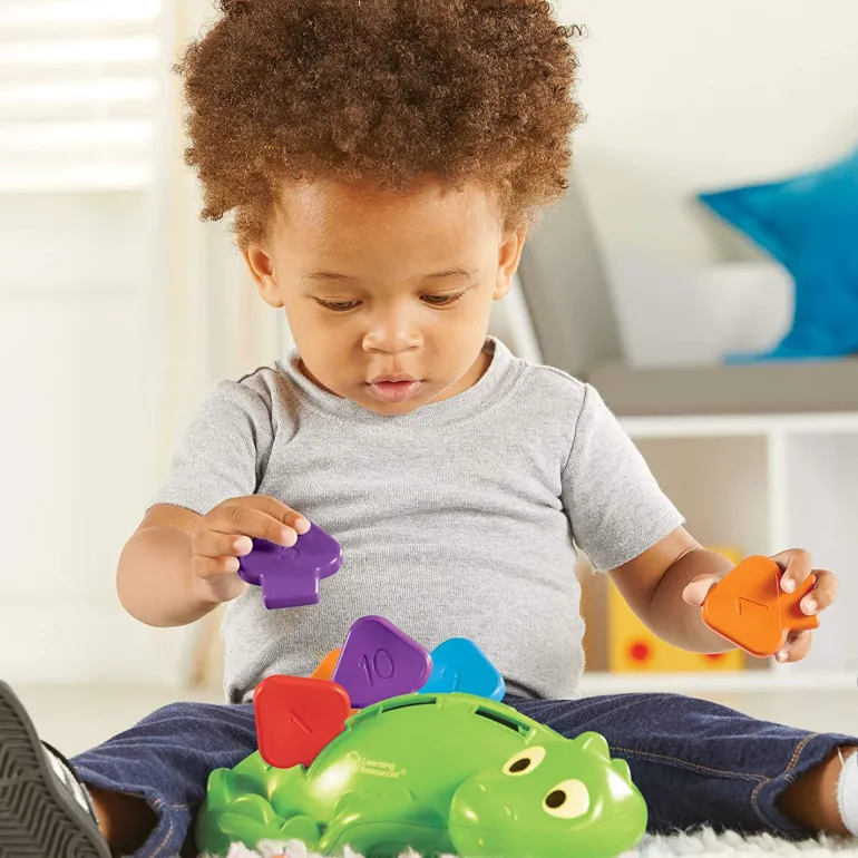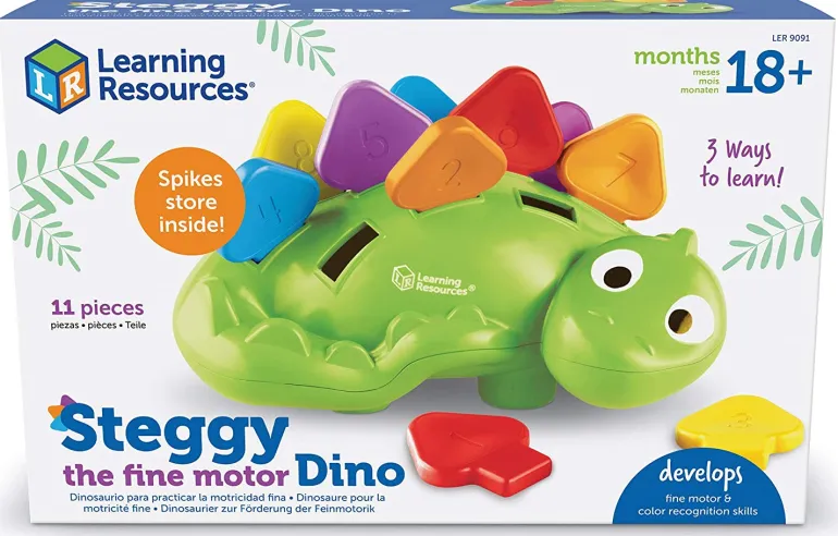 When the fine motor fun is finished for the day, Steggy’s durable plastic scales wipe clean and fit inside for easy storage.