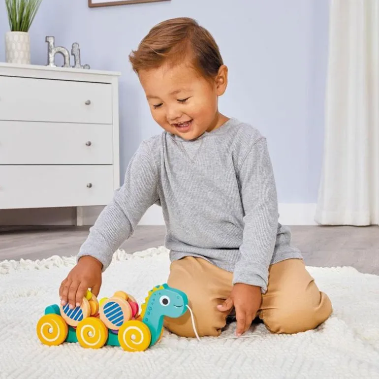 - The Little Tikes Wooden Critters Dino Pull Toy is a 6-wheeled pull-along wooden toy with 2 cargo wheels at the back that also roll when the toy is pulled.