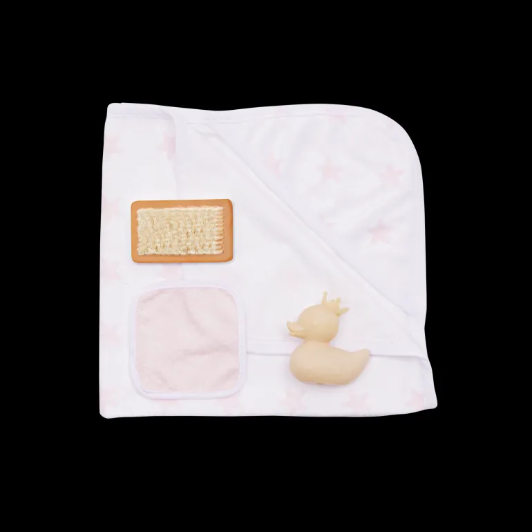 Get baby doll ready for pretend bathtime with this cute LullaBaby accessory set. Kids can “bathe” their baby doll with fun tub accessories, including a washcloth, scrubbing brush, and a toy ducky for extra splashy excitement. Then it’s time to dry off baby and keep them feeling cozy with the hooded bath towel. It’s decorated in a pink star-print pattern for extra cuteness. Perfectly sized for little ones to cuddle, carry, and love, LullaBaby dolls encourage children to develop empathy and caring qualities as they play and grow with their doll. This baby doll accessory set is compatible with most 14″ baby dolls, doll clothing, and accessories. It is safety-tested to meet all BPA and phthalate requirements. Suggested for toddlers ages 2 and up. LullaBaby dolls sold separately.