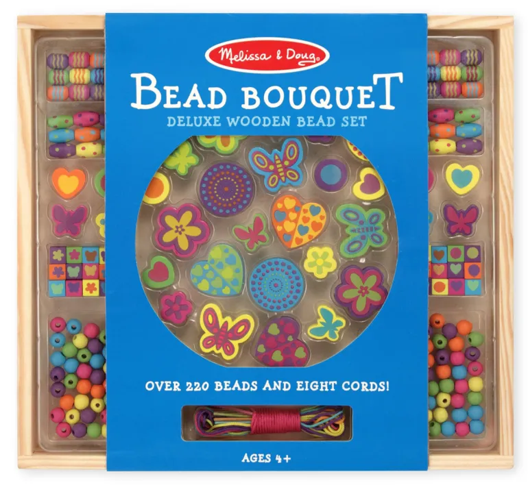 The wooden sorting tray comes stocked with 8 multi coloured cords that can be cut to the size you choose – necklace bracelet, or anklet – and 220 handcrafted heart flower, and butterfly beads with an array of lovely design details.