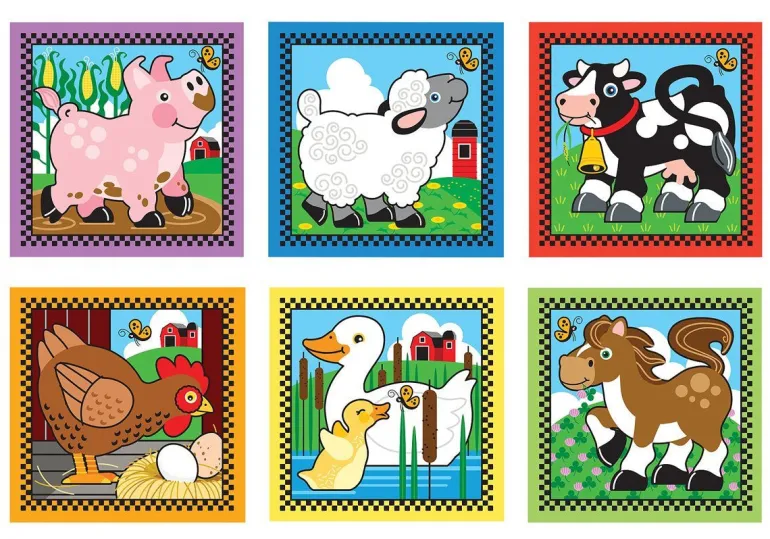 Six puzzles in one! There are 16 solid wooden cubes in this unique puzzle. Rotate the cubes in the included wooden tray to complete colorful pictures of six different farm animals. (The border design provides a helpful hint!)
